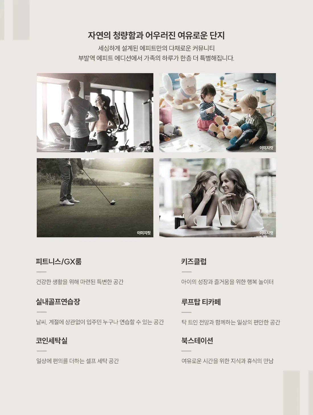 공원형 단지구성과 혁신 평면으로이천의 자부심이 올라갑니다 COMMUNITY일상에 활력과 여유로움을 더하는 에피트만의 특화 커뮤니티로더 특별한 라이프가 펼쳐집니다 이천 부발역 에피트 에디션 계약금 1,000만원으로 입주시까지모델하우스 방문은 사전예약후 방문해 주세요 1544-9131 방문예약